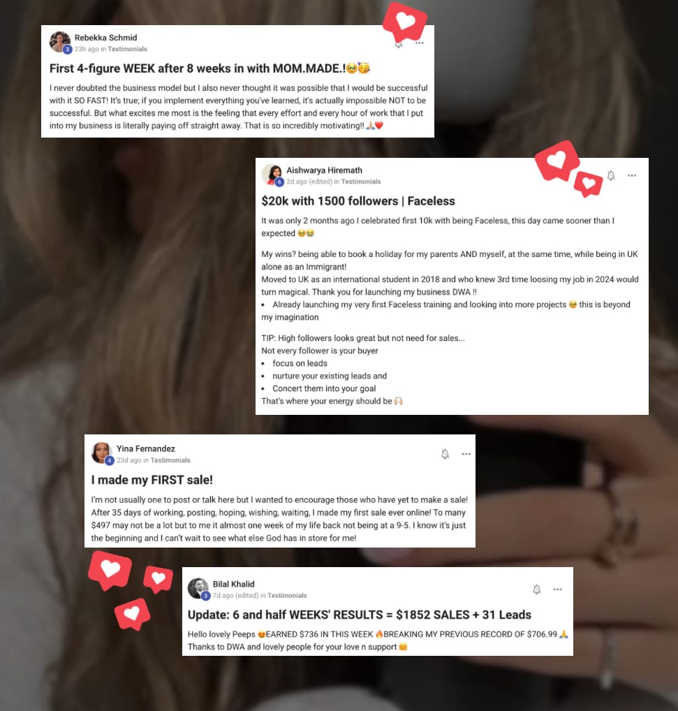 Even with full-time jobs and busy schedules, moms and dads are already making sales with DWA. The system is simple and flexible, allowing them to work in their spare time. With step-by-step training, anyone can start seeing results—proving that it’s possible to create extra income without quitting your day job.